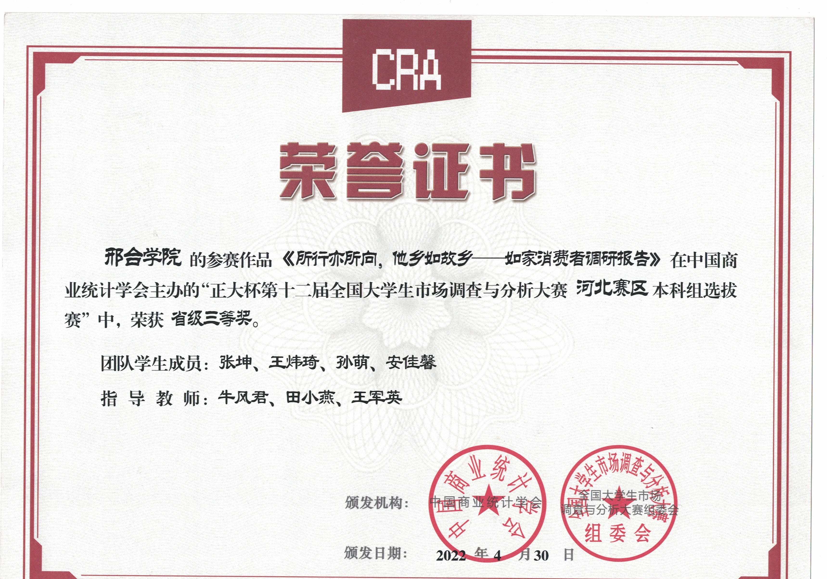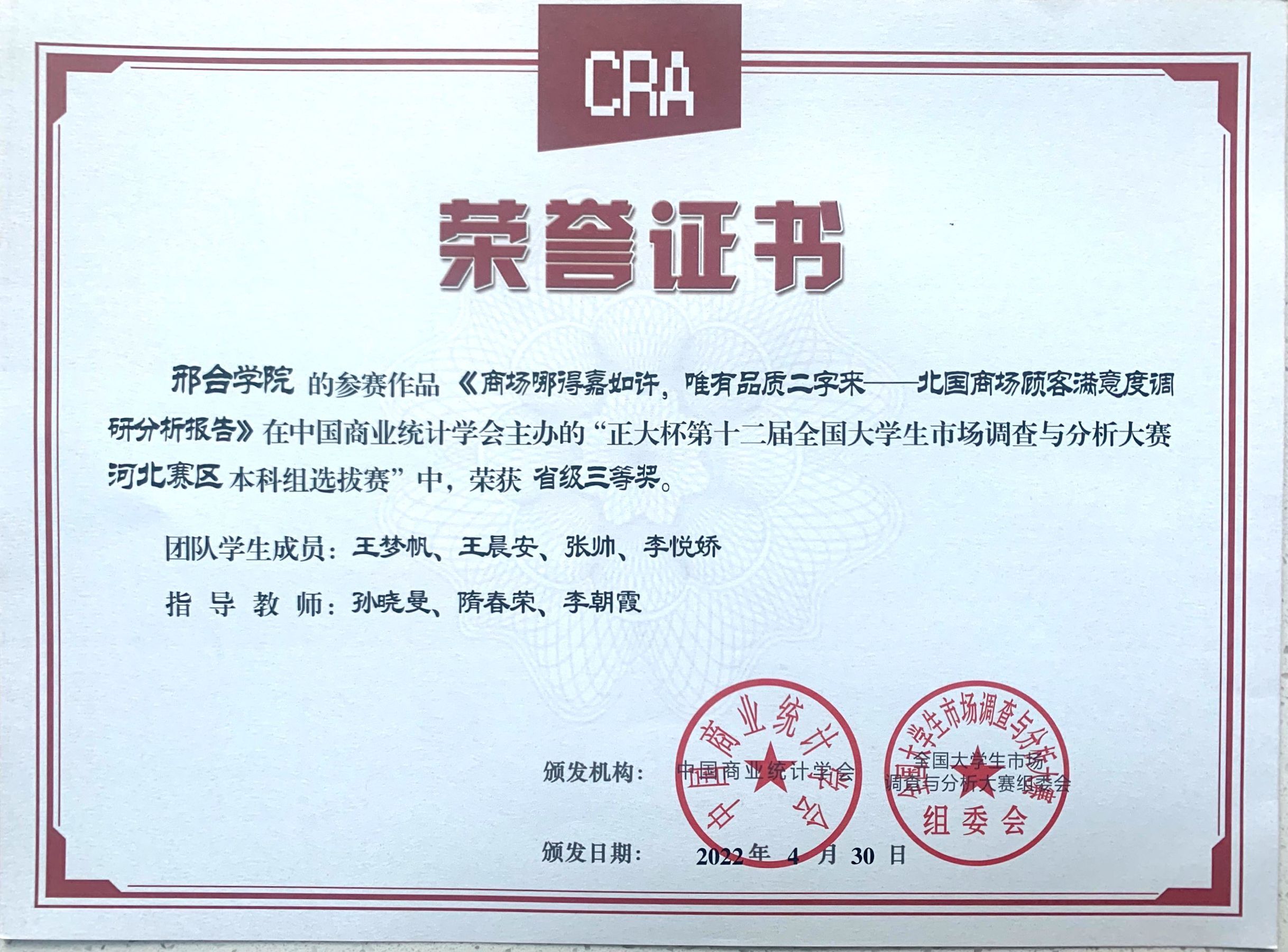 近日获悉,经济与贸易学院学生在“正大杯第十二届全国大学生市场调查与分析大赛河北赛区本科组选拔赛”中取得2项省级三等奖的优异成绩,分别是张坤等人团队的《所行亦所想,他乡如故乡——如家消费者调研报告》,王梦帆等人团队的《商场哪得嘉如许,唯有品质二字来——北国商场顾客满意度调研分析报告》。