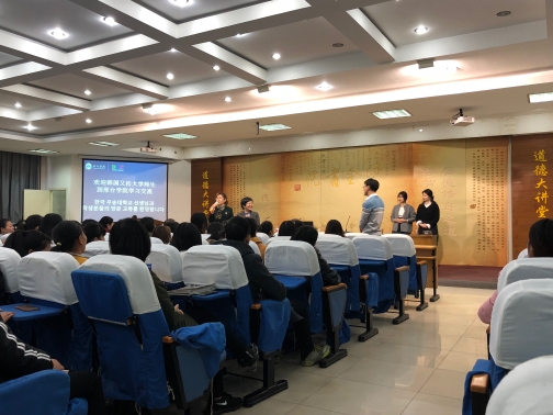 11月21日下午,韩国又松大学商学院酒店观光经营系师生一行四人应邀在我校图书馆报告厅举办专业学习交流活动,我院旅游管理、酒店管理专业130余名同学参加了活动。