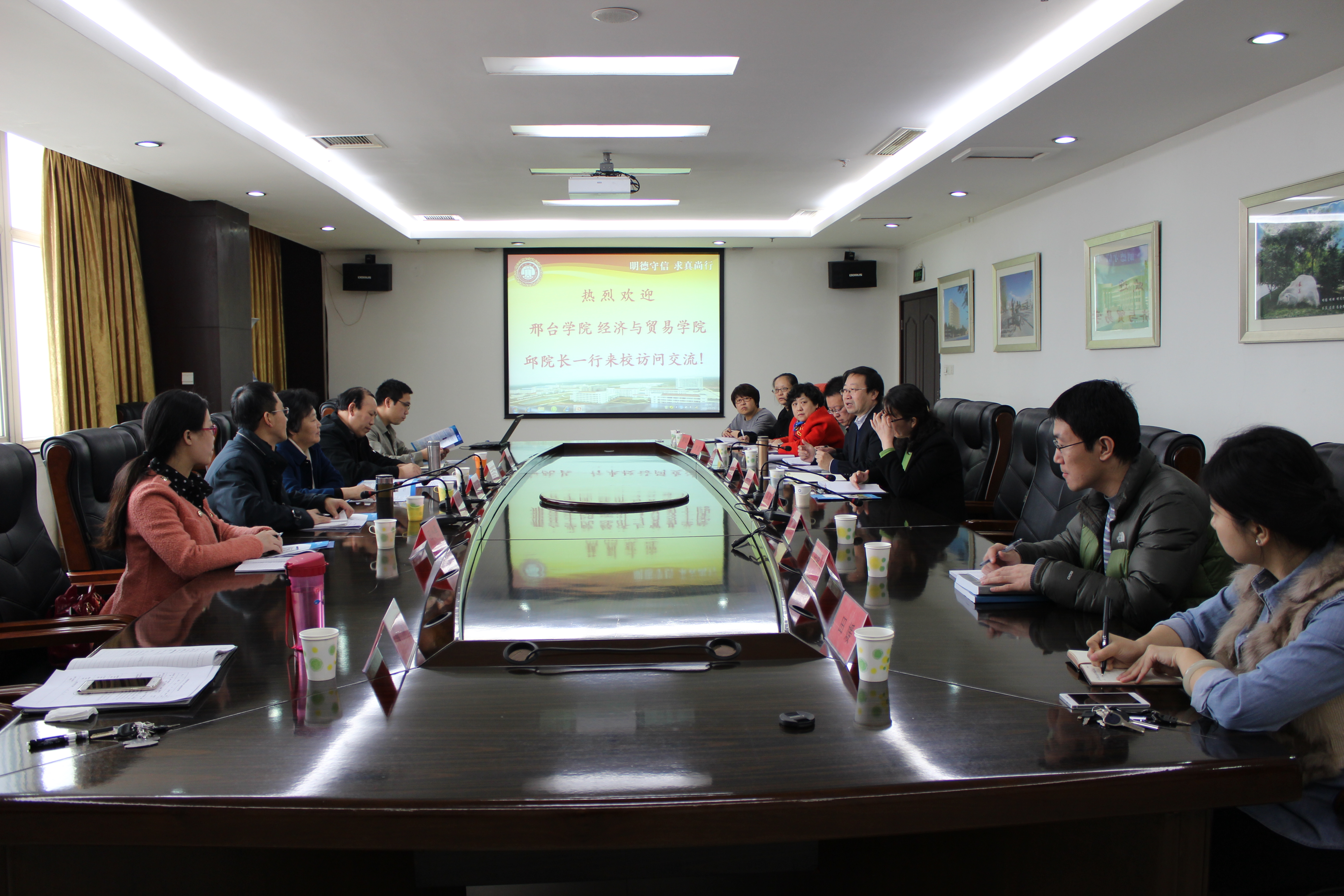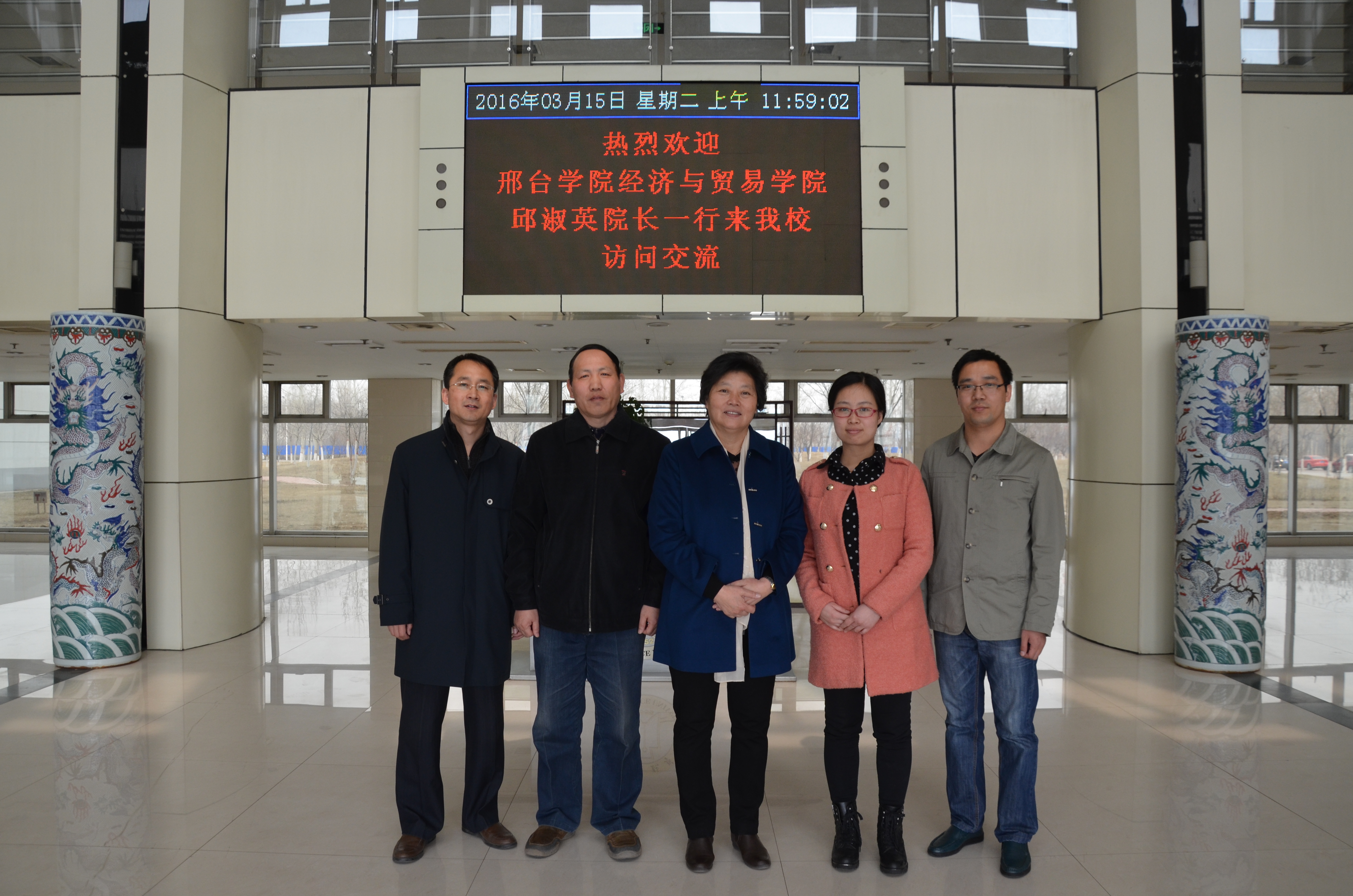 2016年3月15日,经济与贸易学院邱淑英院长、李庆波副院长一行5人赴河北金融学院金融系考察学习,得到了贵校领导的高度重视和热情接待,金融系鲍静海主任、郭净副主任、经济贸易系胡书金主任以及教研室主任等老师做了交流汇报。
