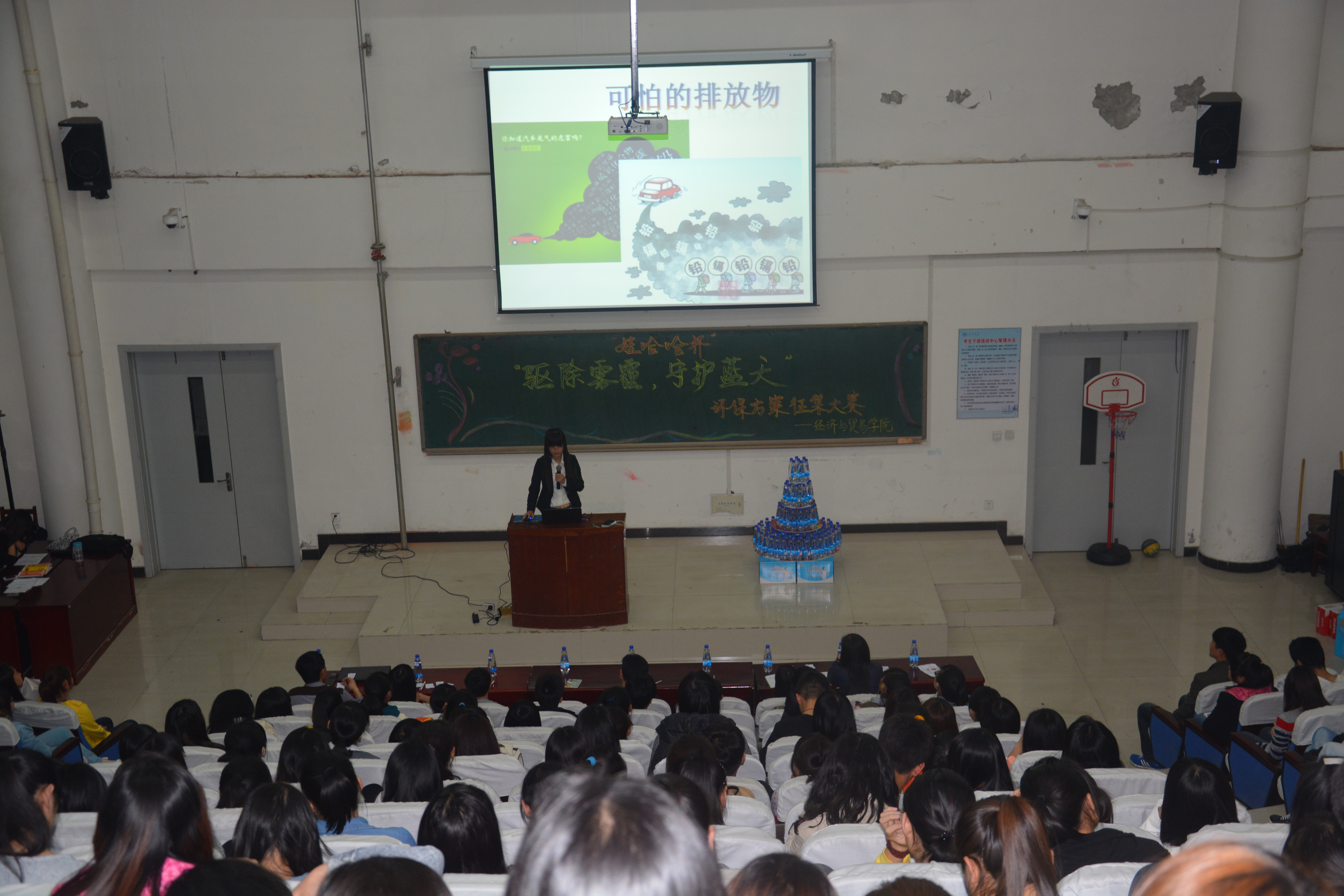 2014年3月28日晚7:00,由娃哈哈与经济与贸易学院团委学生会宣传部联合举办的 “驱除雾霾守护蓝天”为主题的环保方案征集大赛在公教楼312教室拉开帷幕。担当此次比赛的评委有企业代表佟经理,经贸学院团委书记杨光、辅导员李萌、刘佳,团委学生会主席团及各部长。