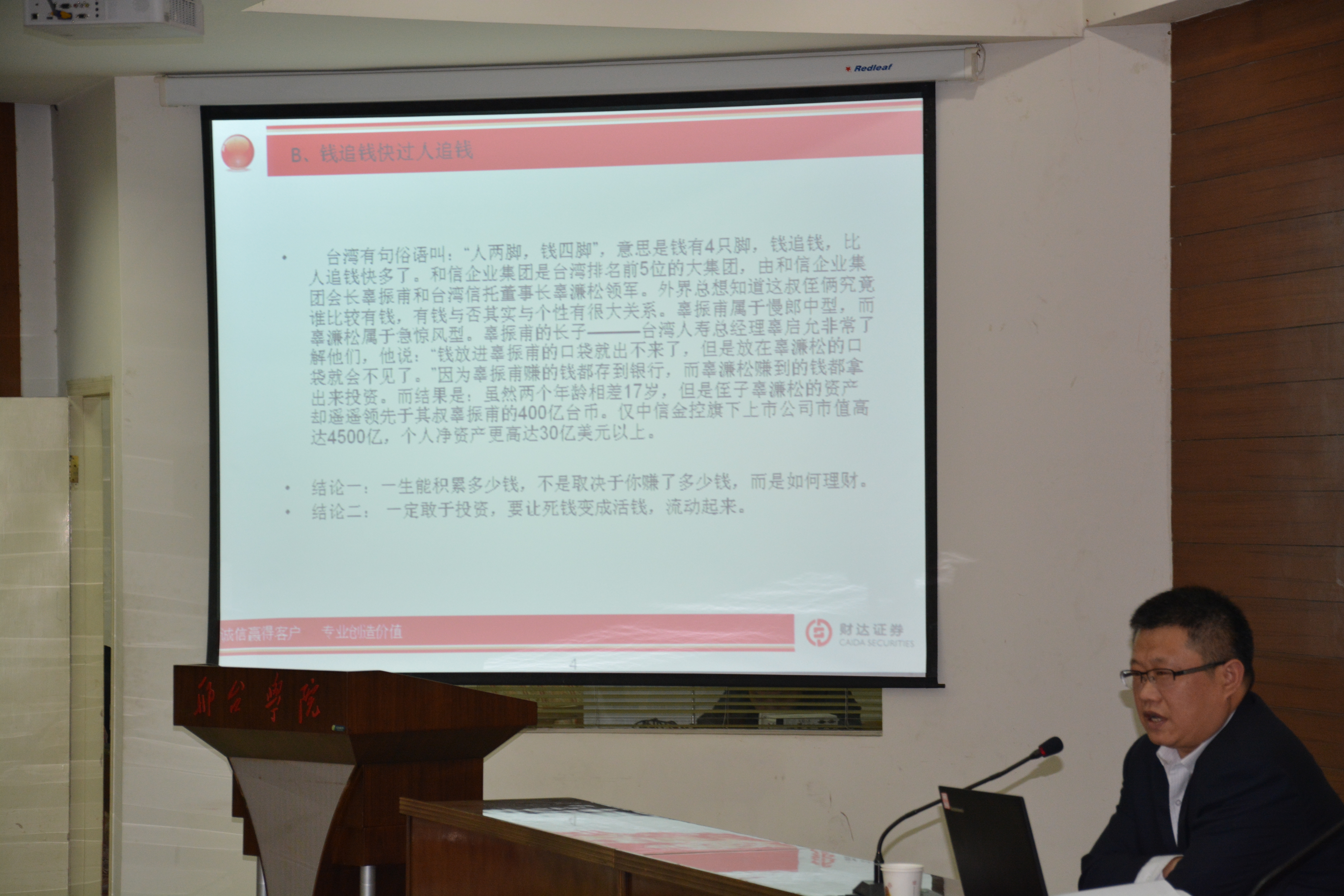 本次讲座,使学生了解了更多投资理财知识,开拓了眼界,拓宽了思路,为今后的学习方向提供了指引,取得了圆满成功。