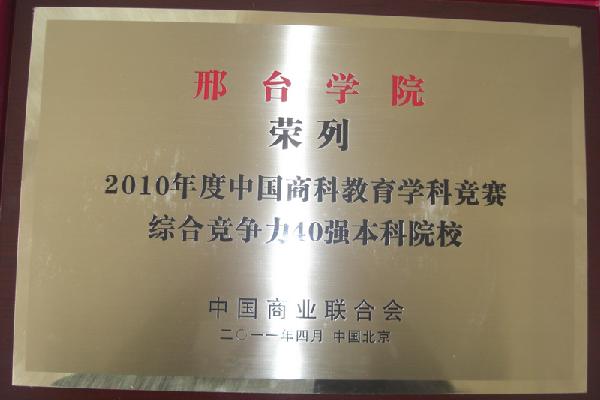在中国商科教育学科竞赛综合竞争力竞赛中,我院贸易经济系代表队经过激烈的角逐,在115所本科院校中脱颖而出,荣获2010年度中国商科教育学科竞赛综合竞争力本科院校40强。