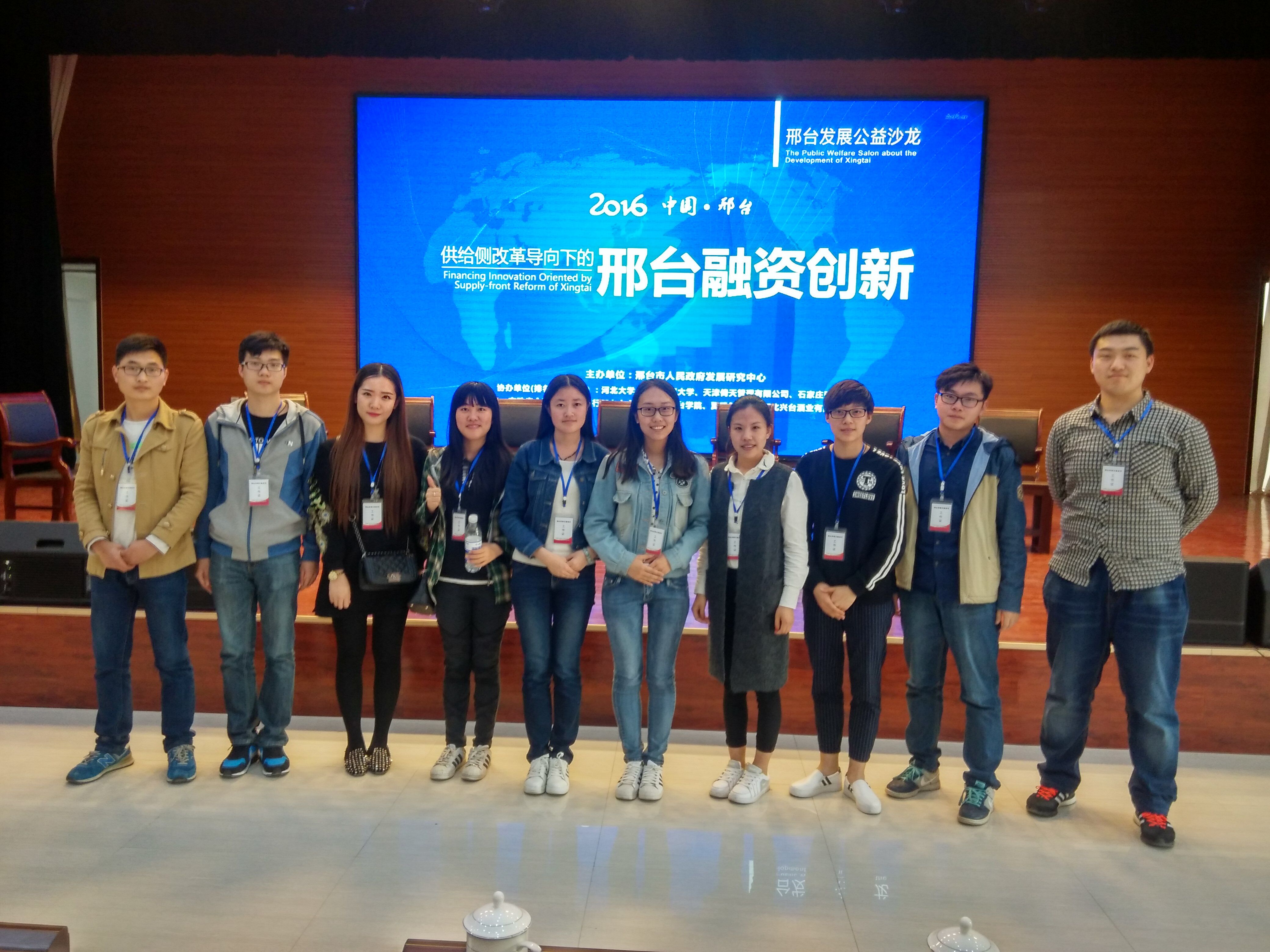 4月9日,首期“邢台发展公益沙龙”在邢台县龙岗经济开发区举行,副市长田建明出席开幕式并致辞,本次活动由邢台市人民政府主办,邢台市人民政府研究室、翼腾创客谷承办,协办单位有市政府金融办、河北大学、河北经贸大学、邢台学院以及河北兴台酒业有限公司,支持媒体有河北日报、河北经济日报、燕赵都市报、邢台日报以及牛城晚报。我校经济与贸易学院院长邱淑英、副院长李庆波以及其他七名教师做为特邀嘉宾出席活动,另有10名经贸学院的学生作为志愿者参与了活动的准备与服务工作。