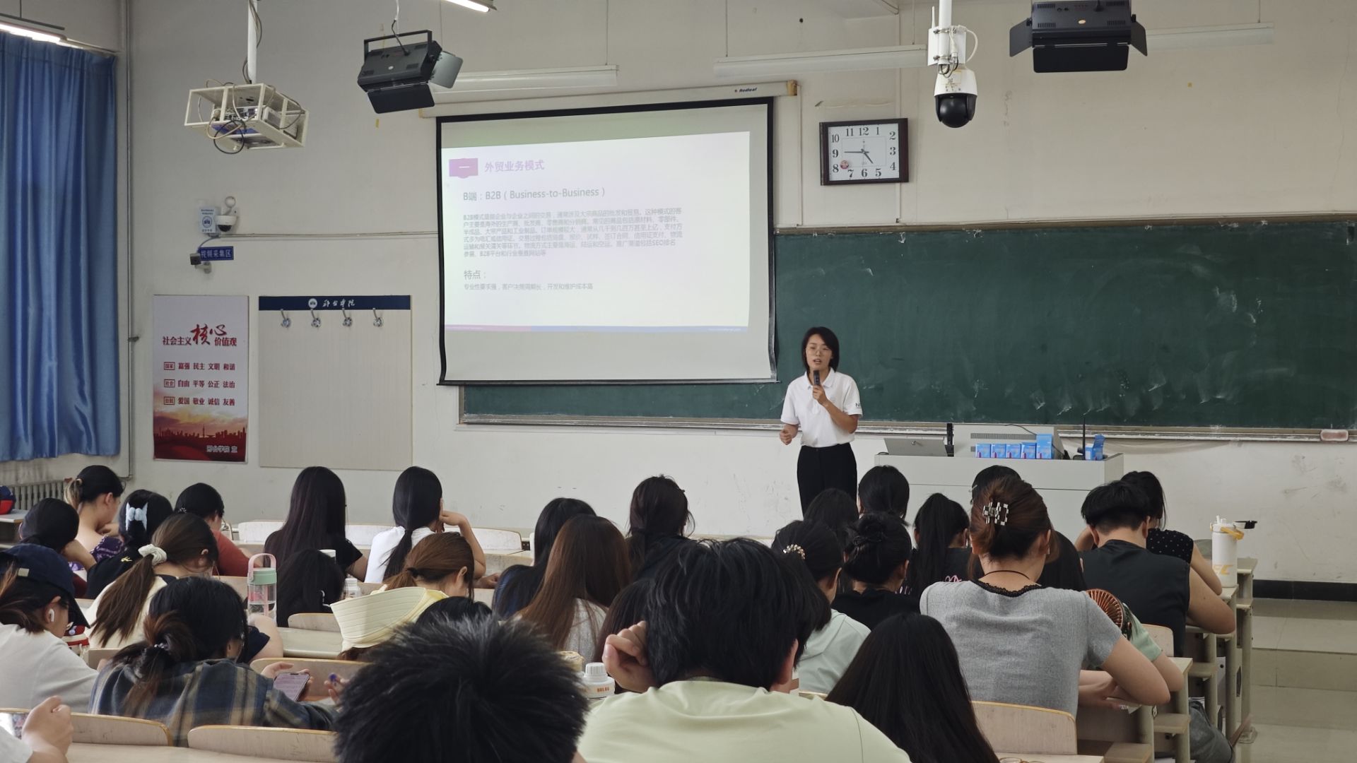 2025年5月19日,李经理为学生进行了首次授课活动。为了将课本内容与实战经验相结合,她从外贸基础知识—外贸业务模式—外贸业务流程,将专业理论与其工作案例实践紧密结合,还原真实外贸业务场景,生动形象的讲述了外贸知识,使得国贸专业学生对外贸行业有了更深刻的认知。