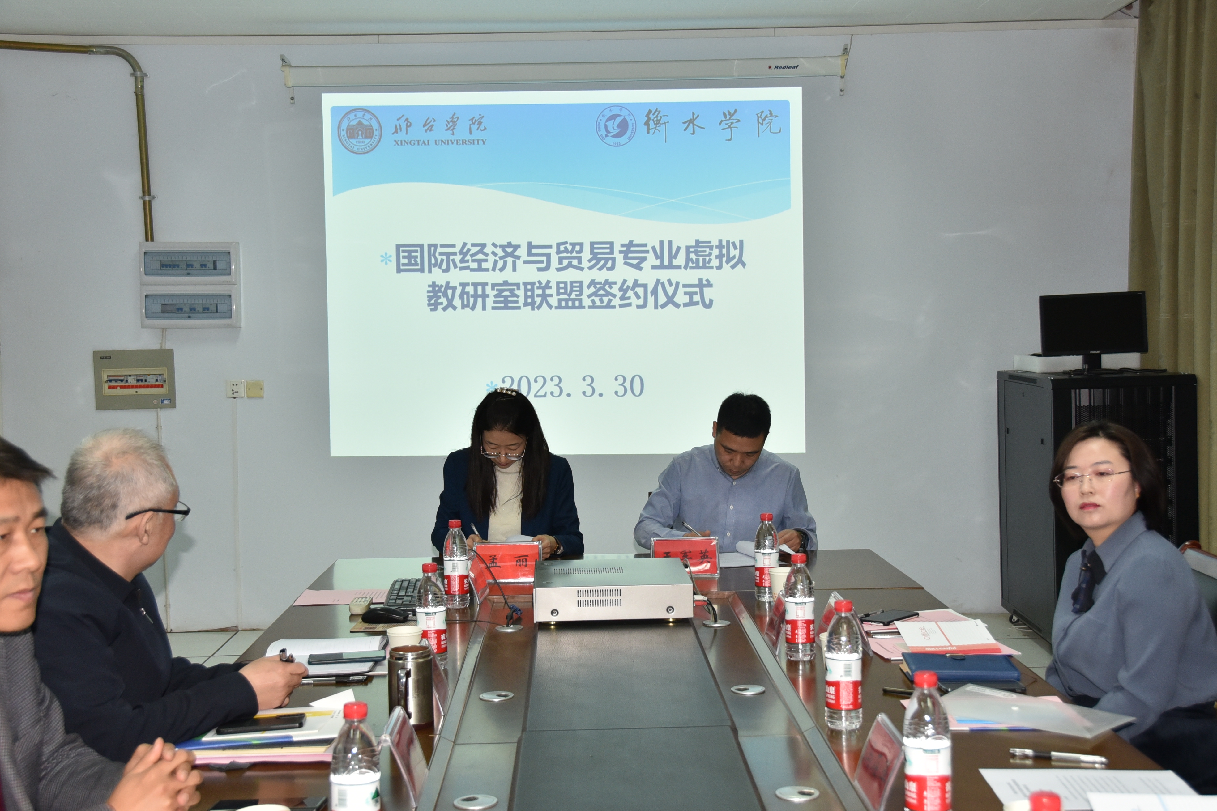 3月30日上午,在衡水学院经济管理学院会议室,举行了“邢台学院-衡水学院国际经济与贸易专业虚拟教研室合作框架协议”签字仪式。我校出席签字仪式的有经济与贸易学院党委书记马在革、副院长王军英,以及各专业教研室主任。衡水学院出席人员有经济管理学院党支部书记孙天亮、院长王铁生、副院长孟丽,以及各专业教研室主任与骨干教师。