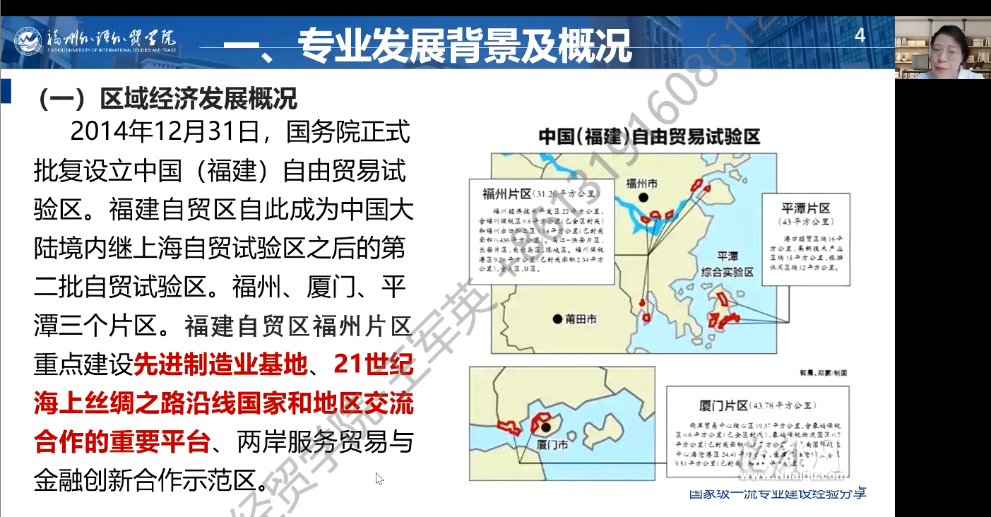 福州外语外贸学院的国际经济与贸易专业是首批入选国家级一流本科专业建设点,刘教授从专业发展背景及概况、专业建设思路与实践及专业建设成效三个方面分享了经验。刘教授先从其所在高校和学院的发展概况进行介绍,接着她作为国家级一流本科专业的负责人详细介绍了国际经济与贸易专业这几年的建设经验和成效,指出要紧密围绕一流本科专业建设目标,依托学校优势学科,结合学校发展战略与专业自身特色,持续推进专业综合改革与建设,提升人才培养质量。