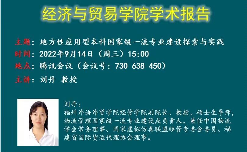 2022年9月14日下午,经济与贸易学院召开国家级一流本科专业建设讲座,本次讲座邀请了福州外语外贸学院经管学院副院长刘丹教授,主题为“地方性应用型本科国家级一流专业建设探索与实践”。此次讲座由经济与贸易学院副院长王军英主持,各教研室主任和骨干教师参加了讲座。