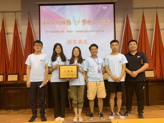 全国大学生“新道杯”沙盘模拟经营大赛以培养创新型复合型人才为目标,是中国商科专业规模最大、影响力最广的赛事之一,大赛开赛至今,已有超过2000所院校参加比赛,近4.5万支参赛队伍,超过20万学生参赛,近万名教师参与,有效推动了商科专业教学改革、课程建设和专业内涵建设。此次河北赛区有来自燕山大学、河北大学、河北金融学院、东北大学、河北地质大学、河北农业大学、河北经贸大学等多所院校50多支代表队。我院由王博文、李泽毅、果志雄、程晓杰、窦佳璇同学组成的本科代表队,在杜鹏老师的带领下,面对强大的对手,积极处理比赛中各种情况,灵活运用所学知识及技能,获得大赛三等奖。充分展现了我院大学生的良好专业素养和水平,彰显了专业学习与实践能力相结合的人才培养理念,展现了专业教学的成果。