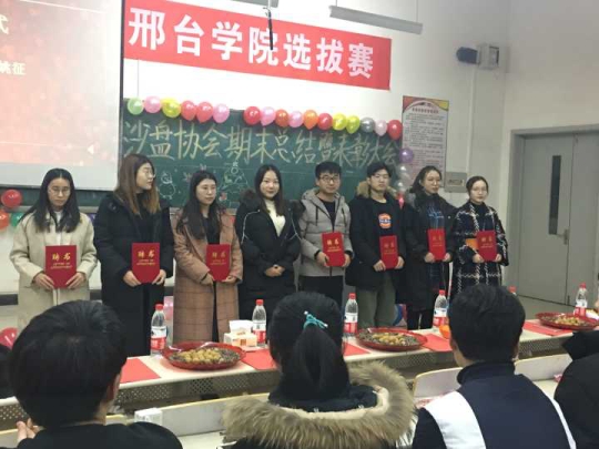 会议首先对获得本年度国赛贡献奖、省赛贡献奖、优秀培训人员、校内赛以及优秀组织等颁奖。沙盘协会会长王依娜同学对沙盘协会一年来的工作进行详细总结,历数取得的成绩,指出存在的问题,提出了明年工作思路。李庆波院长代表院领导班子讲话,对大家取得成绩、对获奖同学表示祝贺,提出经贸学院会一如既往支持沙盘协会工作,加大支持力度。要求沙盘协会组织更多的师生参与到其中,提升学生专业技能。建议沙盘协会拓宽工作思路,组织学生参加更多专业技能比赛,同时以多种形式开展校企合作和创业就业等活动。