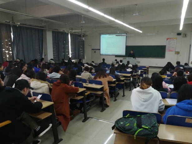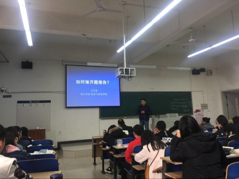 在公教楼515教室,王军英老师为2015级国贸本科班和2017级接本班学生进行培训。王老师首先解释了什么是开题报告,开题报告的意义和作用,然后从研究背景、研究目的和意义、研究思路与方法、研究内容与论文提纲、主要观点、参考文献六个方面,以“我国服务贸易逆差”一题为例,进行系统详细讲解。在讲述过程中,王老师针对学生毕业论文开题中的常见问题,结合实例进行生动的地讲解,并说明了开题报告撰写的注意事项。